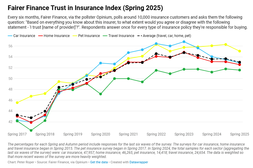 Consumersʼ declining satisfaction with insurers is underscored by the latest trust index from research and rating agency Fairer Finance. Its spring 2025 index, published on June 2, shows a drop in consumer perceptions of the fairness of their insurers across home, motor, travel and pet insurance products.